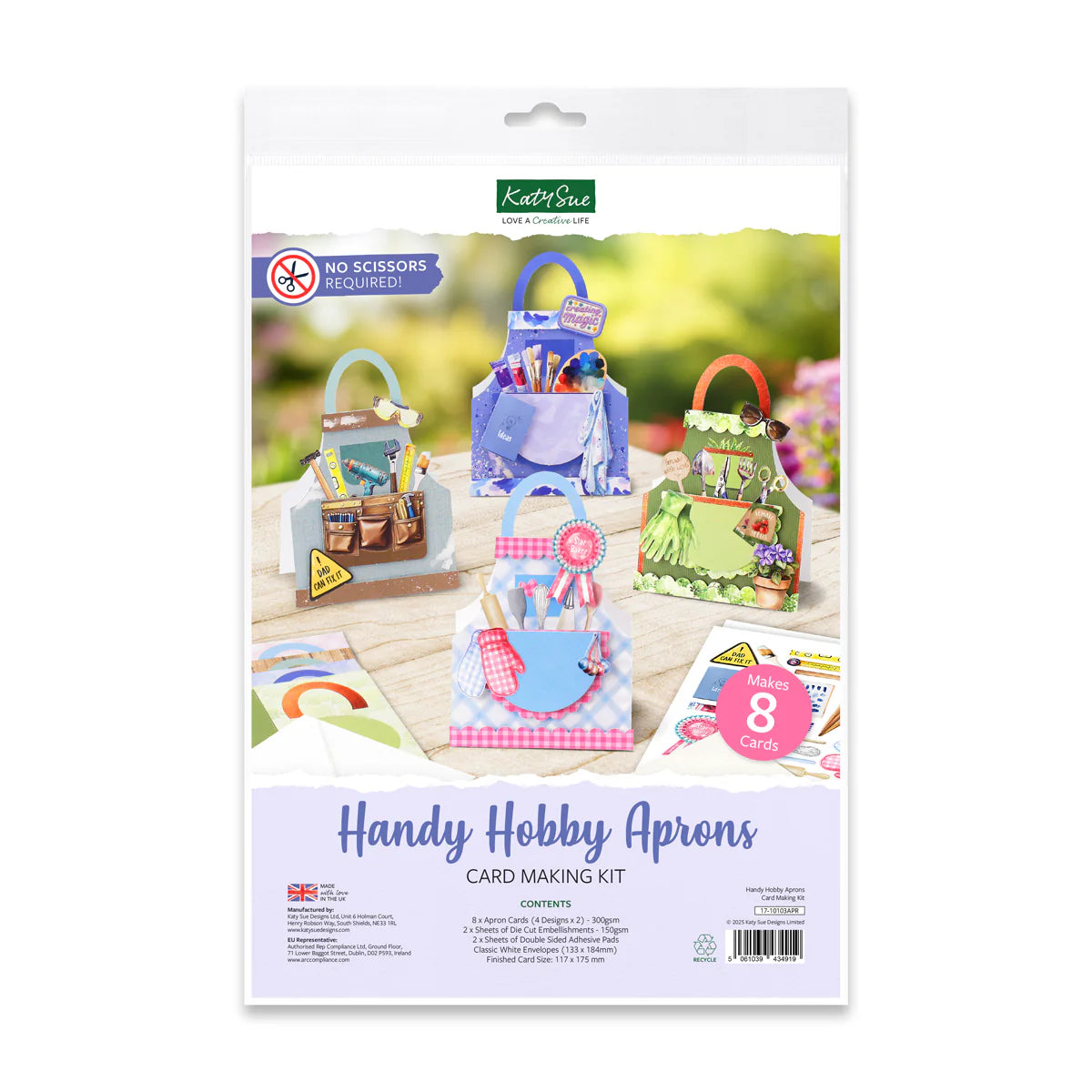 Create 8 unique Apron-shaped cards using the Katy Sue Handy Hobby Aprons Card Making Kit, the perfect personalising greetings for the talented hobbyists in your life! The kit includes four different hobby apron card designs: The Baker, The Gardener, The DIY expert, and The Artist, all in vibrant colourways.